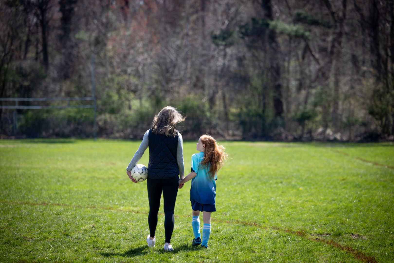 A woman and a girl holding hands walking on a soccer field, the woman carrying a soccer ball.